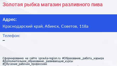 Золотая рыбка, магазин разливного пива по адресу Краснодарский край, Абинск, Советов, 118а в дальнейшем Организация, размещена в следующих категориях: