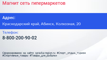 Магнит, сеть гипермаркетов по адресу Краснодарский край, Абинск, Колхозная, 20 в дальнейшем Организация, размещена в следующих категориях: