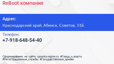 ReBoot, компания по адресу Краснодарский край, Абинск, Советов, 51Б в дальнейшем Организация, размещена в следующих категориях: