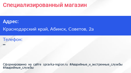 Специализированный магазин по адресу Краснодарский край, Абинск, Советов, 2а в дальнейшем Организация, размещена в следующих категориях: