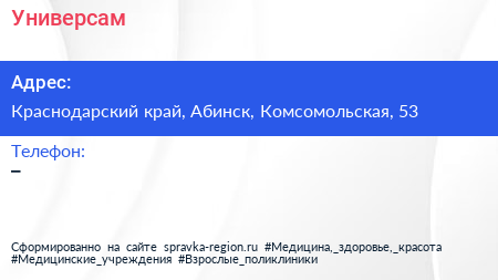 Универсам по адресу Краснодарский край, Абинск, Комсомольская, 53 в дальнейшем Организация, размещена в следующих категориях:
