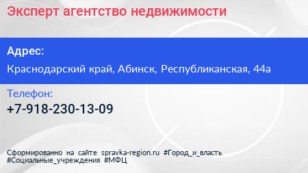 Эксперт, агентство недвижимости по адресу Краснодарский край, Абинск, Республиканская, 44а в дальнейшем Организация, размещена в следующих категориях: