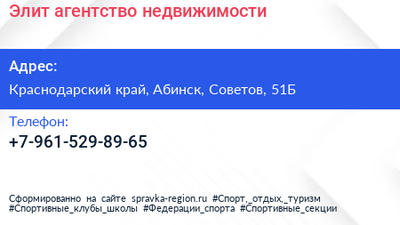 Элит, агентство недвижимости по адресу Краснодарский край, Абинск, Советов, 51Б в дальнейшем Организация, размещена в следующих категориях: