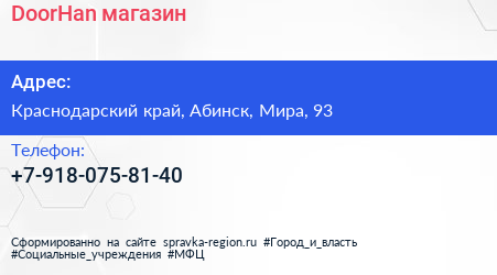 DoorHan, магазин по адресу Краснодарский край, Абинск, Мира, 93 в дальнейшем Организация, размещена в следующих категориях:
