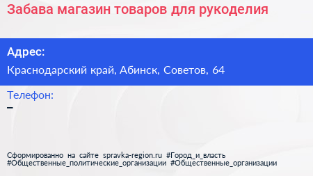 Забава, магазин товаров для рукоделия по адресу Краснодарский край, Абинск, Советов, 64 в дальнейшем Организация, размещена в следующих категориях: