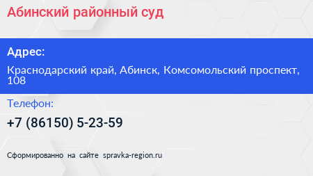 Абинский районный суд по адресу Краснодарский край, Абинск, Комсомольский проспект, 108 в дальнейшем Организация, размещена в следующих категориях: