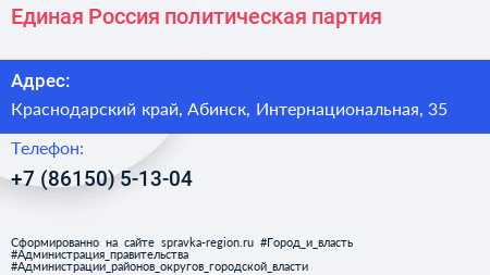 Единая Россия, политическая партия по адресу Краснодарский край, Абинск, Интернациональная, 35 в дальнейшем Организация, размещена в следующих категориях: