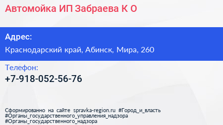 Автомойка, ИП Забраева К.О. по адресу Краснодарский край, Абинск, Мира, 260 в дальнейшем Организация, размещена в следующих категориях: