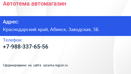Автотема, автомагазин по адресу Краснодарский край, Абинск, Заводская, 5Б в дальнейшем Организация, размещена в следующих категориях: