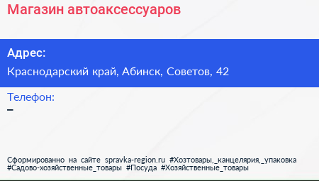 Магазин автоаксессуаров по адресу Краснодарский край, Абинск, Советов, 42 в дальнейшем Организация, размещена в следующих категориях: