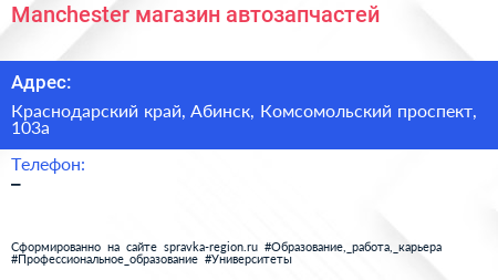 Manchester, магазин автозапчастей по адресу Краснодарский край, Абинск, Комсомольский проспект, 103а в дальнейшем Организация, размещена в следующих категориях: