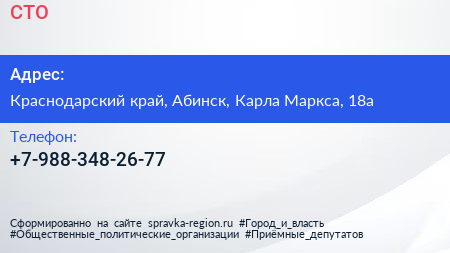 СТО по адресу Краснодарский край, Абинск, Карла Маркса, 18а в дальнейшем Организация, размещена в следующих категориях: