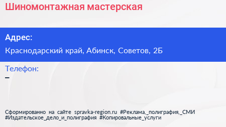 Шиномонтажная мастерская по адресу Краснодарский край, Абинск, Советов, 2Б в дальнейшем Организация, размещена в следующих категориях: