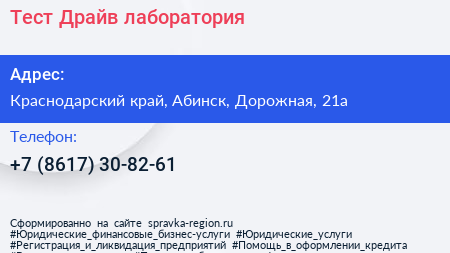 Тест-Драйв, лаборатория по адресу Краснодарский край, Абинск, Дорожная, 21а в дальнейшем Организация, размещена в следующих категориях: