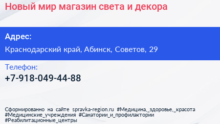 Новый мир, магазин света и декора по адресу Краснодарский край, Абинск, Советов, 29 в дальнейшем Организация, размещена в следующих категориях:
