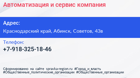 Автоматизация и сервис, компания по адресу Краснодарский край, Абинск, Советов, 43в в дальнейшем Организация, размещена в следующих категориях: