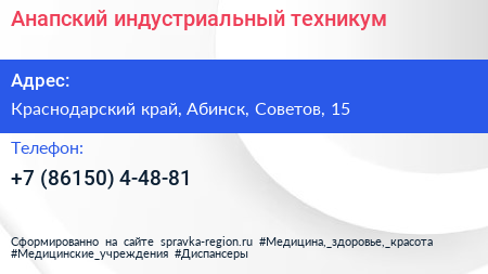 Анапский индустриальный техникум по адресу Краснодарский край, Абинск, Советов, 15 в дальнейшем Организация, размещена в следующих категориях: