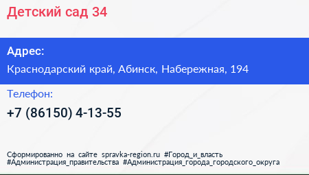 Детский сад №34 по адресу Краснодарский край, Абинск, Набережная, 194 в дальнейшем Организация, размещена в следующих категориях: