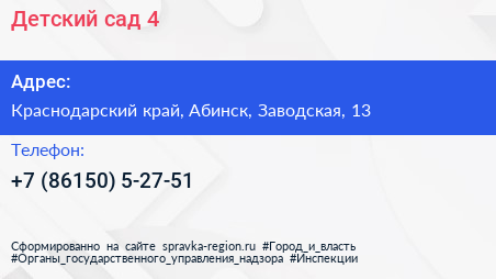 Детский сад №4 по адресу Краснодарский край, Абинск, Заводская, 13 в дальнейшем Организация, размещена в следующих категориях: