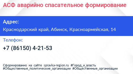АСФ, аварийно-спасательное формирование по адресу Краснодарский край, Абинск, Красноармейская, 14 в дальнейшем Организация, размещена в следующих категориях: