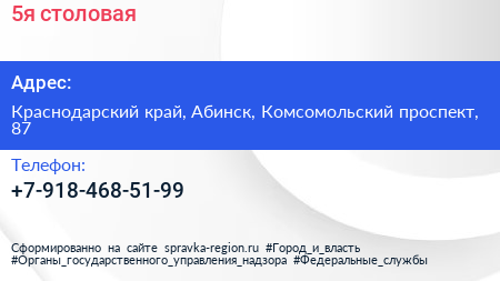 5я, столовая по адресу Краснодарский край, Абинск, Комсомольский проспект, 87 в дальнейшем Организация, размещена в следующих категориях: