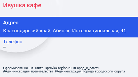 Ивушка, кафе по адресу Краснодарский край, Абинск, Интернациональная, 41 в дальнейшем Организация, размещена в следующих категориях: