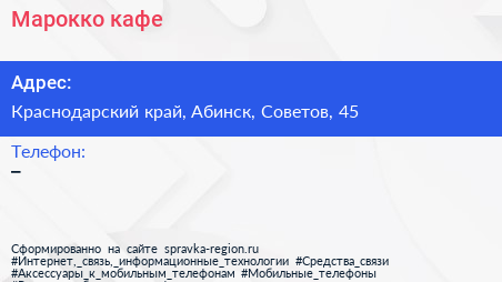 Марокко, кафе по адресу Краснодарский край, Абинск, Советов, 45 в дальнейшем Организация, размещена в следующих категориях: