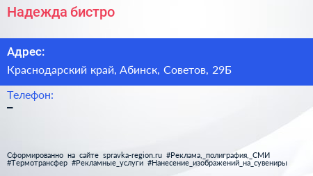 Надежда, бистро по адресу Краснодарский край, Абинск, Советов, 29Б в дальнейшем Организация, размещена в следующих категориях: