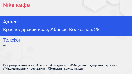 Nika, кафе по адресу Краснодарский край, Абинск, Колхозная, 28г в дальнейшем Организация, размещена в следующих категориях: