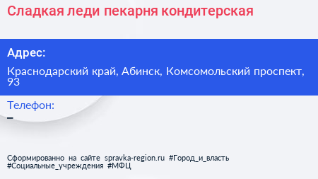 Сладкая леди, пекарня-кондитерская по адресу Краснодарский край, Абинск, Комсомольский проспект, 93 в дальнейшем Организация, размещена в следующих категориях:
