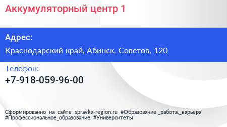 Аккумуляторный центр №1 по адресу Краснодарский край, Абинск, Советов, 120 в дальнейшем Организация, размещена в следующих категориях: