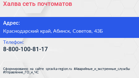 Халва, сеть почтоматов по адресу Краснодарский край, Абинск, Советов, 43Б в дальнейшем Организация, размещена в следующих категориях: