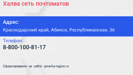 Халва, сеть почтоматов по адресу Краснодарский край, Абинск, Республиканская, 36 в дальнейшем Организация, размещена в следующих категориях: