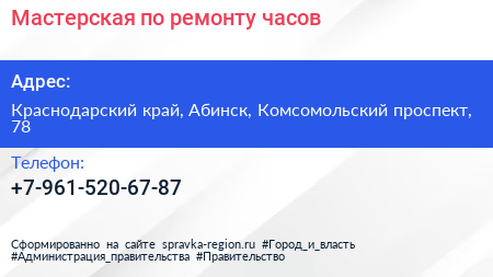 Мастерская по ремонту часов по адресу Краснодарский край, Абинск, Комсомольский проспект, 78 в дальнейшем Организация, размещена в следующих категориях: