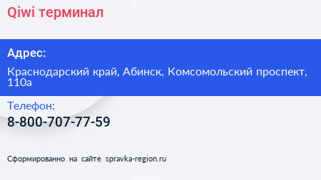Qiwi, терминал по адресу Краснодарский край, Абинск, Комсомольский проспект, 110а в дальнейшем Организация, размещена в следующих категориях: