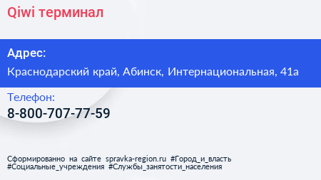 Qiwi, терминал по адресу Краснодарский край, Абинск, Интернациональная, 41а в дальнейшем Организация, размещена в следующих категориях: