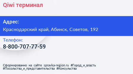Qiwi, терминал по адресу Краснодарский край, Абинск, Советов, 192 в дальнейшем Организация, размещена в следующих категориях: