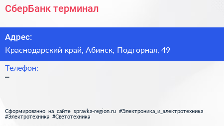 СберБанк, терминал по адресу Краснодарский край, Абинск, Подгорная, 49 в дальнейшем Организация, размещена в следующих категориях: