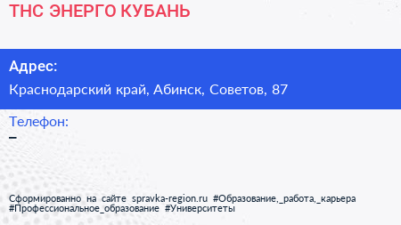 ТНС ЭНЕРГО КУБАНЬ по адресу Краснодарский край, Абинск, Советов, 87 в дальнейшем Организация, размещена в следующих категориях: