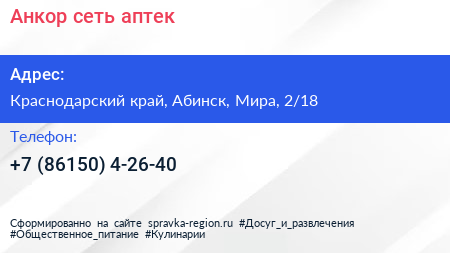Анкор, сеть аптек по адресу Краснодарский край, Абинск, Мира, 2/18 в дальнейшем Организация, размещена в следующих категориях: