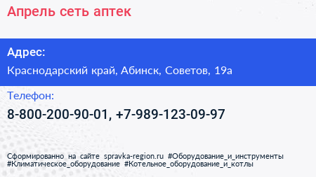 Апрель, сеть аптек по адресу Краснодарский край, Абинск, Советов, 19а в дальнейшем Организация, размещена в следующих категориях: