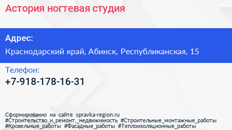 Астория, ногтевая студия по адресу Краснодарский край, Абинск, Республиканская, 15 в дальнейшем Организация, размещена в следующих категориях: