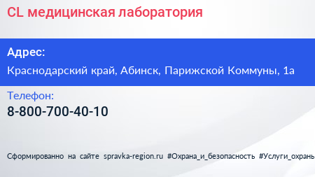 CL, медицинская лаборатория по адресу Краснодарский край, Абинск, Парижской Коммуны, 1а в дальнейшем Организация, размещена в следующих категориях: