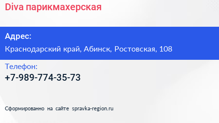 Diva, парикмахерская по адресу Краснодарский край, Абинск, Ростовская, 108 в дальнейшем Организация, размещена в следующих категориях: