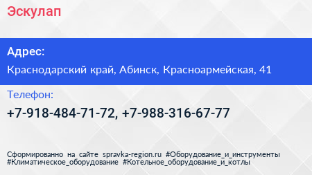 Эскулап по адресу Краснодарский край, Абинск, Красноармейская, 41 в дальнейшем Организация, размещена в следующих категориях: