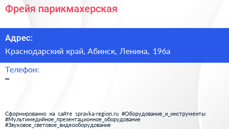 Фрейя, парикмахерская по адресу Краснодарский край, Абинск, Ленина, 196а в дальнейшем Организация, размещена в следующих категориях: