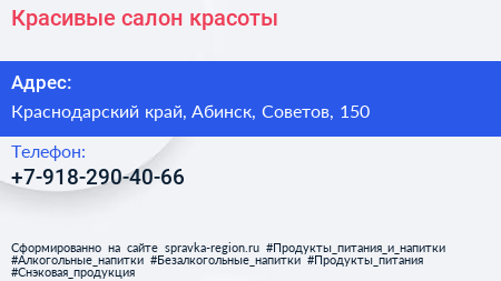 Красивые, салон красоты по адресу Краснодарский край, Абинск, Советов, 150 в дальнейшем Организация, размещена в следующих категориях: