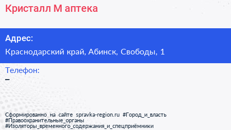 Кристалл-М, аптека по адресу Краснодарский край, Абинск, Свободы, 1 в дальнейшем Организация, размещена в следующих категориях: