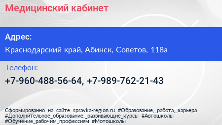 Медицинский кабинет по адресу Краснодарский край, Абинск, Советов, 118а в дальнейшем Организация, размещена в следующих категориях:
