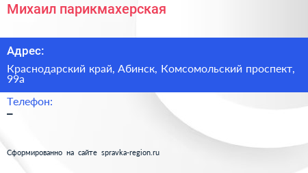 Михаил, парикмахерская по адресу Краснодарский край, Абинск, Комсомольский проспект, 99а в дальнейшем Организация, размещена в следующих категориях: